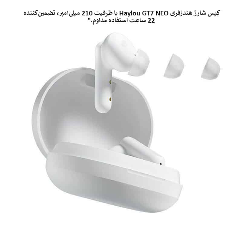 پک 5 عددی Haylou GT7 NEO همراه با کیس شارژ 210 میلیآمپری ارائه میشود که امکان 22 ساعت استفاده از ایربادها را فراهم میکند. هر ایرباد نیز با باتری 35 میلیآمپری، تا 6.5 ساعت پخش مداوم موسیقی را ممکن میسازد.