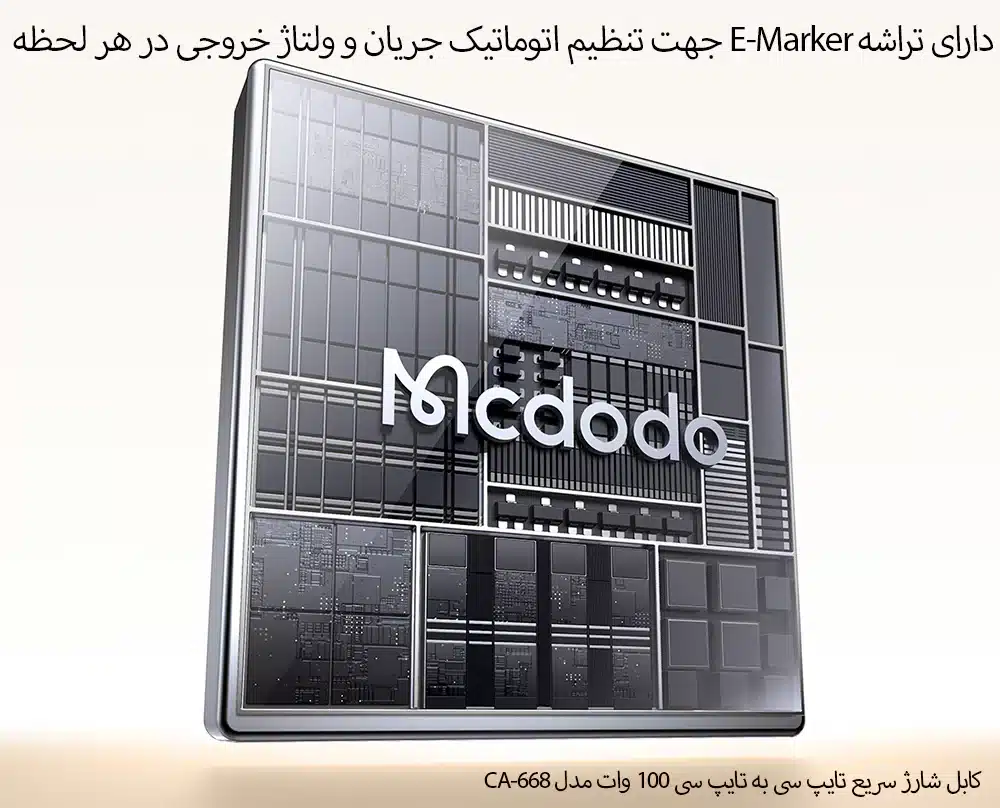 این کابل مجهز به چیپ اختصاصی مک دودو است که به صورت هوشمند از شارژ بیش از حد جلوگیری میکند. به محض شارژ کامل دستگاه، کابل بهطور خودکار جریان را قطع میکند تا از باتری گوشی یا لپتاپ شما محافظت شود.