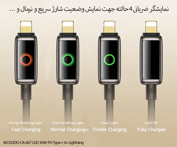 این کابل مجهز به چیپ اختصاصی مک دودو است که از شارژ بیش از حد جلوگیری میکند. به محض تکمیل شارژ دستگاه، جریان برق بهطور خودکار قطع میشود تا باتری گوشی یا آیپد شما عمر طولانیتری داشته باشد.