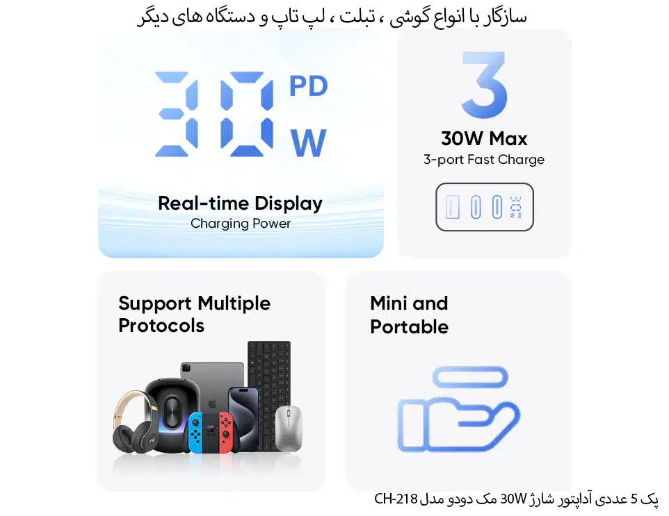 پک 5 عددی شارژر دیواری 30 وات مک دودو مدل CH-218، یک شارژر فست و هوشمند است که با طراحی دیجیتال خود، امکان شارژ سریع و کارآمد دستگاههای مختلف را فراهم میکند. این شارژر با پشتیبانی از پروتکلهای PD و PPS، قادر است دستگاههای Apple، Samsung، لپتاپها و دیگر گجتها را با سرعت بالا شارژ کند. اگر به دنبال یک شارژر مقاوم، قدرتمند و هوشمند هستید، این محصول گزینهای عالی برای شماست.