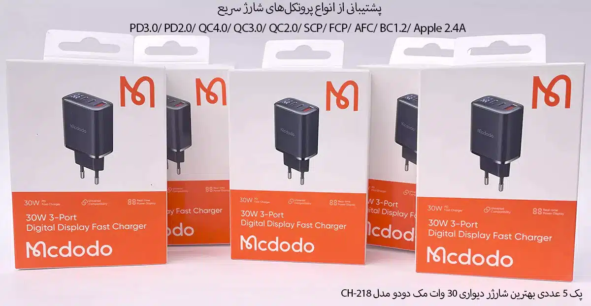 پک 5 عددی شارژر دیواری 30 وات مک دودو مدل CH-218 با نمایشگر دیجیتال